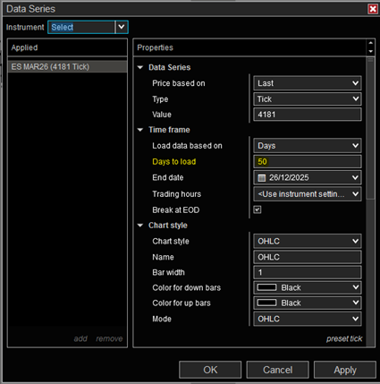 La cantidad de días que cargas en un gráfico no solo afecta cómo ves el mercado, también impacta directamente en el rendimiento de NinjaTrader. Entre más historial cargues, más pesada se vuelve la plataforma y más lenta puede sentirse.